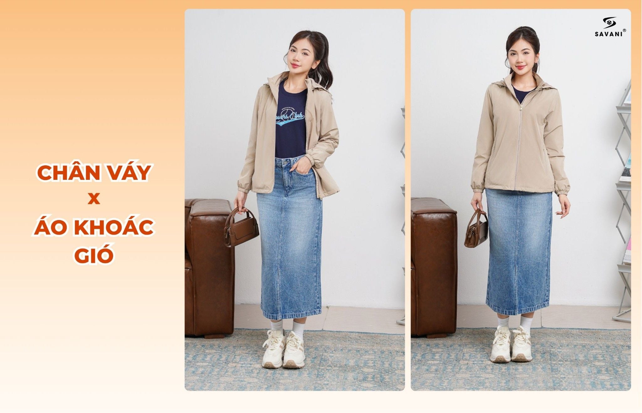 Chân váy dài + Áo khoác gió