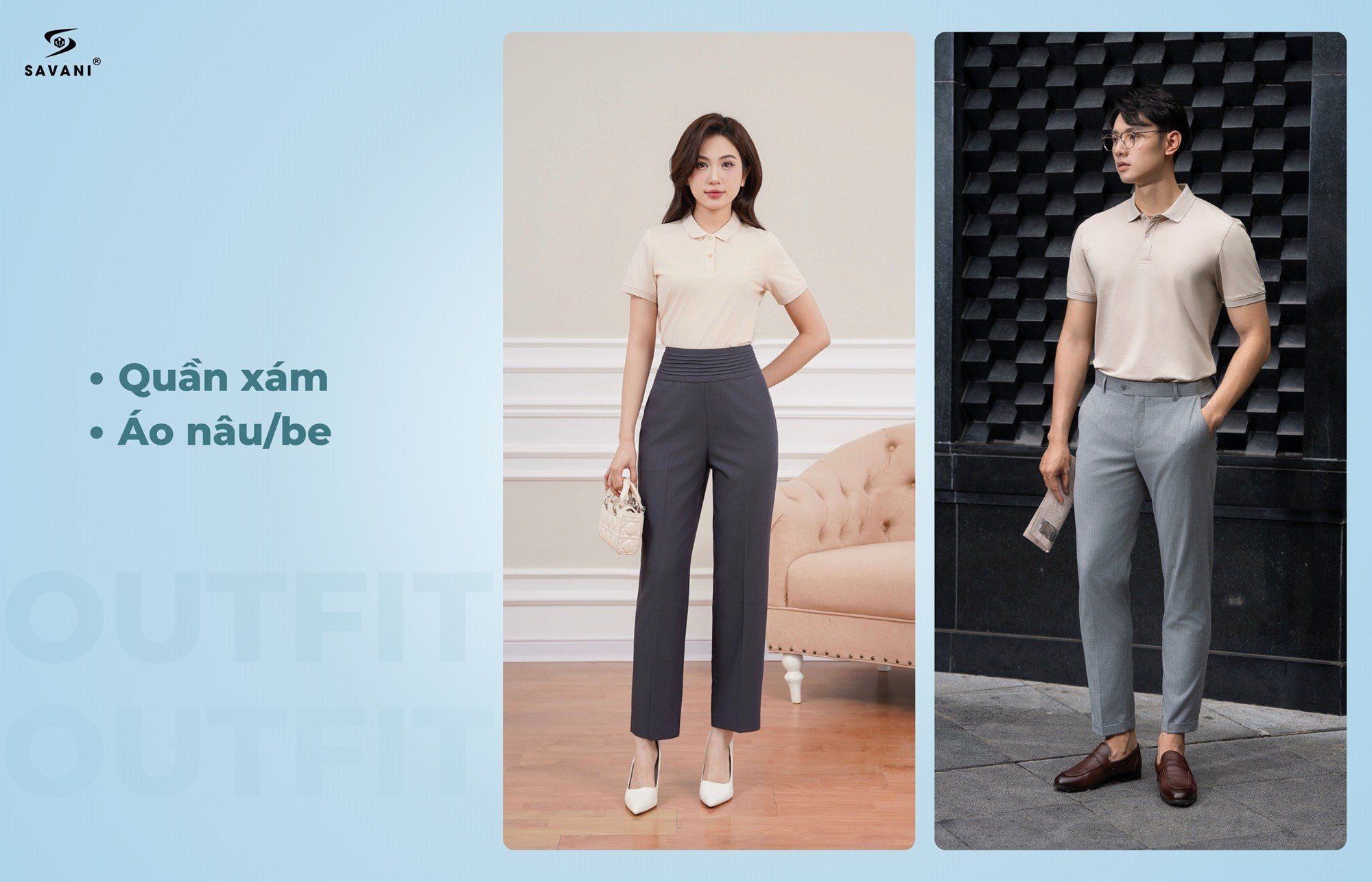 Với lựa chọn đơn giản những vẫn tinh tế, nhẹ nhàng thì sự kết hợp quần xám với áo nâu hoặc be chính là “chân ái”. Outfit này đặc biệt phù hợp với những buổi gặp gỡ, hẹn hò hoặc môi trường làm việc yêu cầu sự chỉn chu, tối giản.
