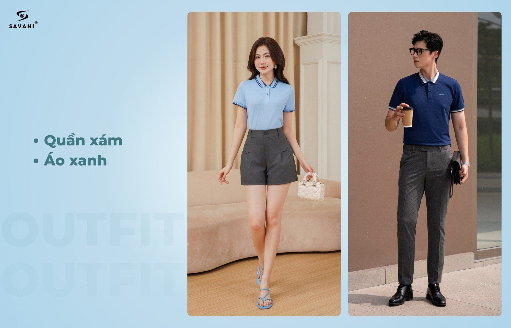 Quần xám khi kết hợp cùng áo xanh navy hoặc xanh biển mang đến một tổng thể hài hòa. Sắc xám trung tính giúp “làm nền” để tông xanh thêm nổi bật, tạo cảm giác hiện đại, khỏe khoắn và lịch sự. Bộ đôi này cực kỳ linh hoạt: nam hay nữ đều có thể diện khi đi học, đi làm, dạo phố hay gặp gỡ bạn bè mà vẫn giữ được sự thanh lịch.