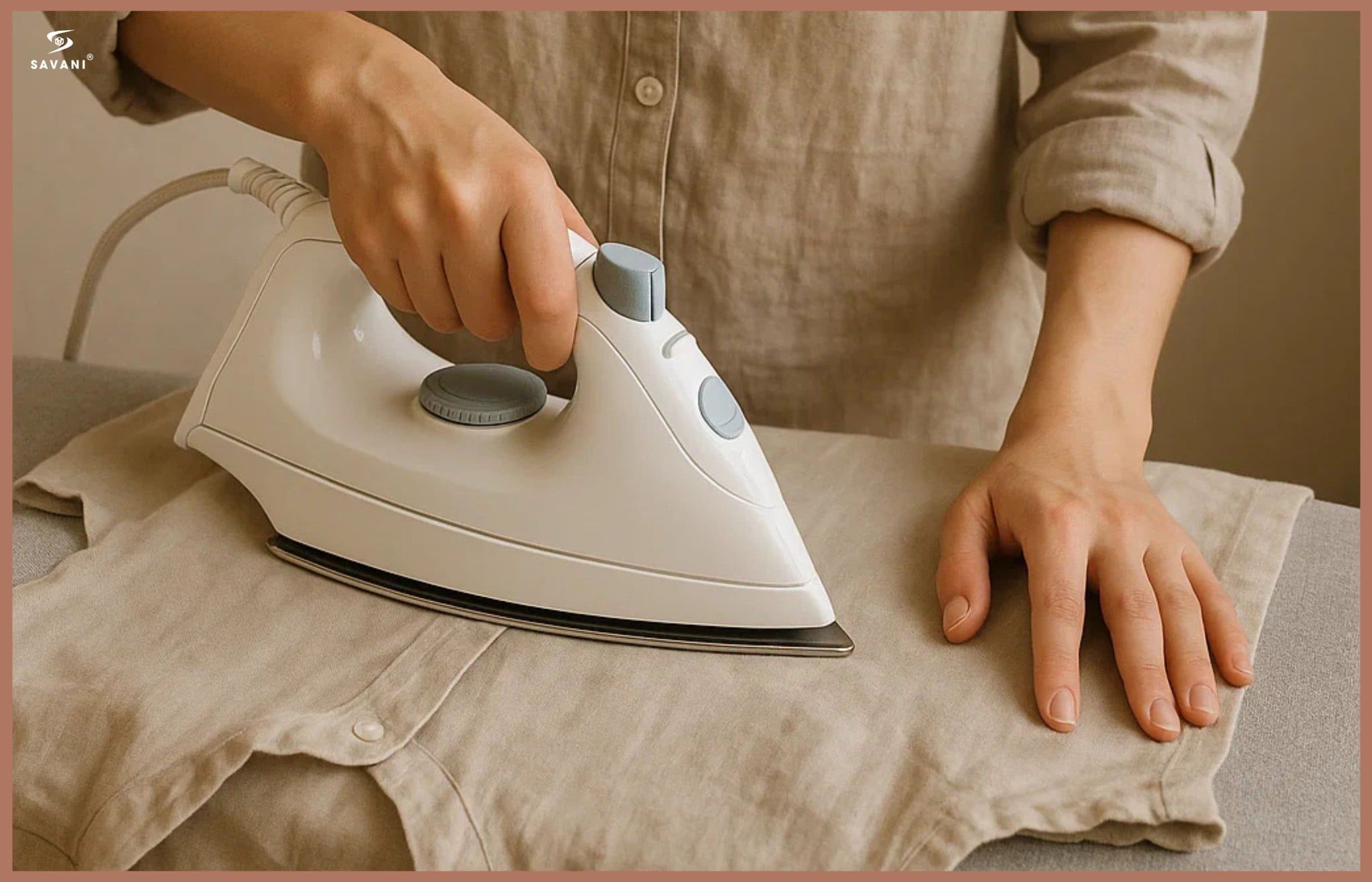 Ưu tiên bàn là có hơi nước mạnh, điều chỉnh nhiệt độ dưới 200°C để làm mềm sợi lanh và xóa nếp nhăn nhanh chóng. Tốt nhất nên ủi khi vải còn hơi ẩm, vì linen lúc này sẽ phẳng dễ hơn và không cần ủi nhiều lần.