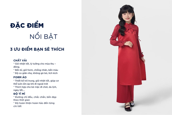 Áo dài trẻ em được xem là một món đồ mà bất kì cha mẹ nào cũng nên lựa cho con. Áo dài là sản phẩm vô cùng cần thiết trong thời điểm thu đông vì áo dài giữ nhiệt tốt, giúp cơ thể luôn ấm áp trong thời tiết lạnh. Đồng thời, cấu trúc sợi dệt thoáng khí giúp hạn chế hầm bí và tích nhiệt, mang lại cảm giác dễ chịu khi mặc cả ngày.
