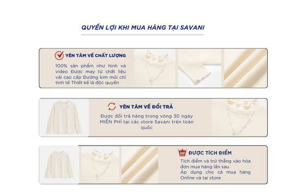 - Hỗ trợ đổi hàng trong vòng 30 ngày và miễn phí tại tất cả chi nhánh thuộc hệ thống thời trang Savani.
