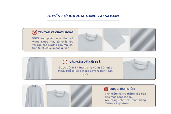 - Hỗ trợ đổi hàng trong vòng 30 ngày và miễn phí tại tất cả chi nhánh thuộc hệ thống thời trang Savani.