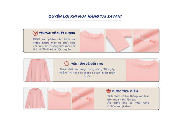 - Hỗ trợ đổi hàng trong vòng 30 ngày và miễn phí tại tất cả chi nhánh thuộc hệ thống thời trang Savani.