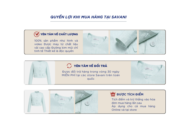 - Hỗ trợ đổi hàng trong vòng 30 ngày và miễn phí tại tất cả chi nhánh thuộc hệ thống thời trang Savani.