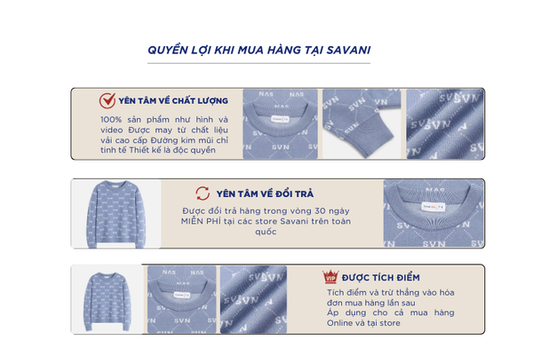 - Hỗ trợ đổi hàng trong vòng 30 ngày và miễn phí tại tất cả chi nhánh thuộc hệ thống thời trang Savani.