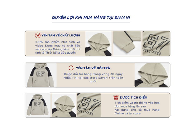 Áo nỉ trẻ em là một trong những sản phẩm tiên phong được Savani đặc biệt chú trọng về chất liệu. Sự kết hợp giữa sợi tự nhiên (Cotton) với sự bền bỉ, chống nhăn của sợi tổng hợp (Polyester) và độ co giãn linh hoạt của Spandex tạo nên một chất liệu mang lại cảm giác thoải mái, giữ form tốt và phù hợp cho các hoạt động năng động.