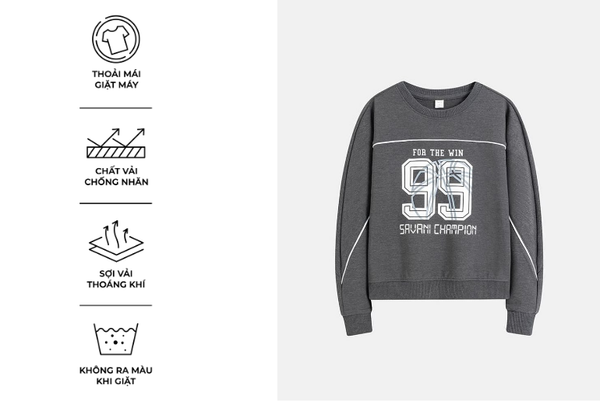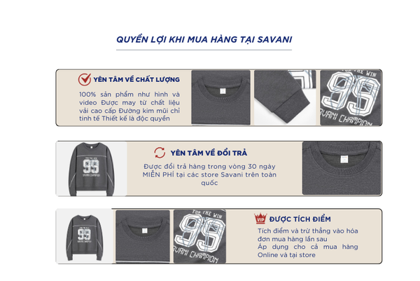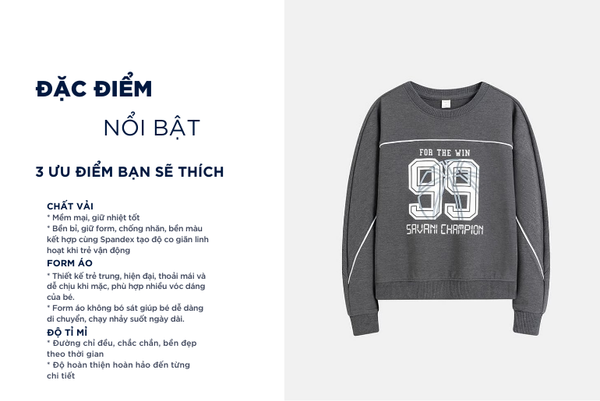Áo nỉ trẻ em là một trong những sản phẩm tiên phong được Savani đặc biệt chú trọng về chất liệu. Sự kết hợp giữa sợi tự nhiên (Cotton) với sự bền bỉ, chống nhăn của sợi tổng hợp (Polyester) và độ co giãn linh hoạt của Spandex tạo nên một chất liệu mang lại cảm giác thoải mái, giữ form tốt và phù hợp cho các hoạt động năng động.