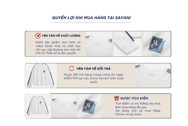 - Hỗ trợ đổi hàng trong vòng 30 ngày và miễn phí tại tất cả chi nhánh thuộc hệ thống thời trang Savani.