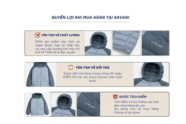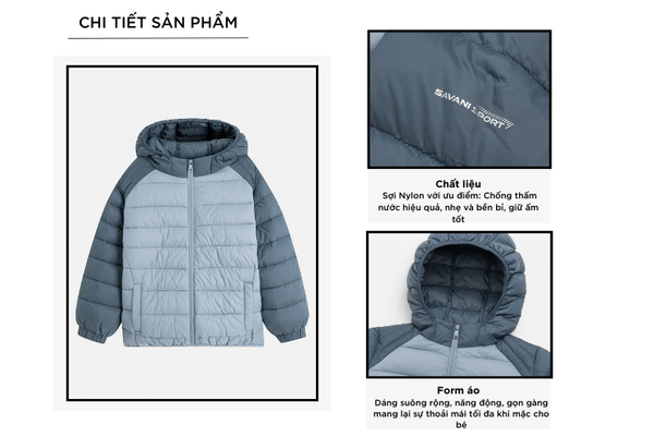 Áo phao trẻ em là một trong những sản phẩm tiên phong được Savani đặc biệt chú trọng về chất liệu. Được sử dụng hoàn toàn bằng Nylon (100%) giúp sản phẩm có các ưu điểm như: Độ bền cao, chống nhăn, chống gió, chống thấm nước, giữ ấm hiệu quả