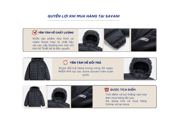 - Hỗ trợ đổi hàng trong vòng 30 ngày và miễn phí tại tất cả chi nhánh thuộc hệ thống thời trang Savani.