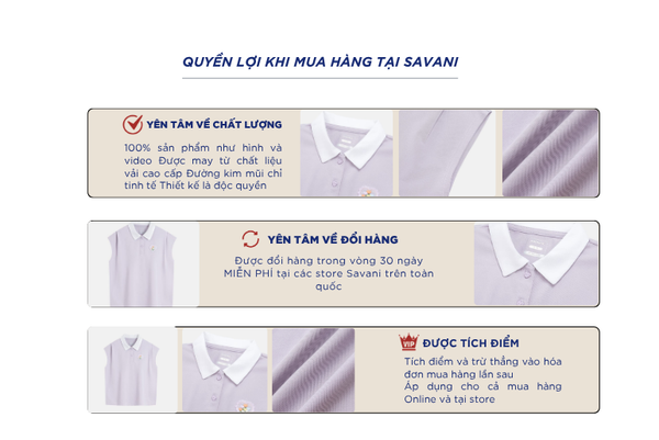 - Hỗ trợ đổi hàng trong vòng 30 ngày và miễn phí tại tất cả chi nhánh thuộc hệ thống thời trang Savani.