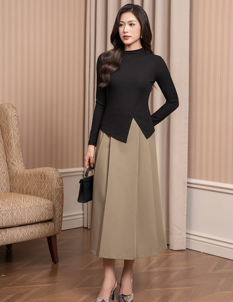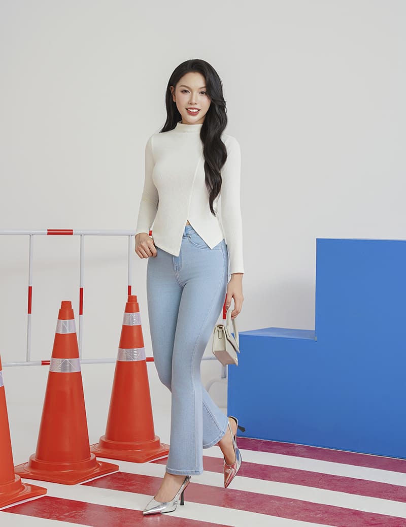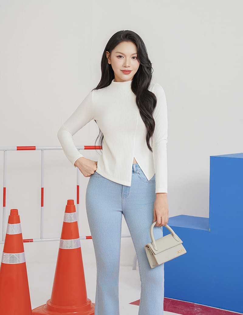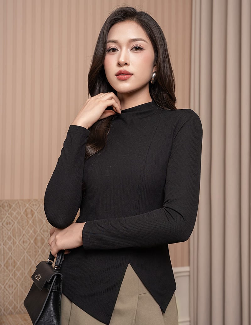 Áo thun nữ dài tay cổ cao gấu chéo cách điệu