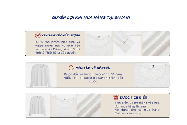 - Hỗ trợ đổi hàng trong vòng 30 ngày và miễn phí tại tất cả chi nhánh thuộc hệ thống thời trang Savani.