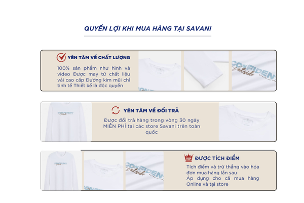 - Hỗ trợ đổi hàng trong vòng 30 ngày và miễn phí tại tất cả chi nhánh thuộc hệ thống thời trang Savani.