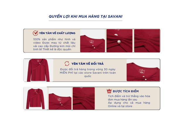 - Hỗ trợ đổi hàng trong vòng 30 ngày và miễn phí tại tất cả chi nhánh thuộc hệ thống thời trang Savani.