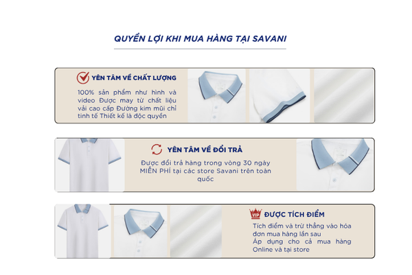 - Hỗ trợ đổi hàng trong vòng 30 ngày và miễn phí tại tất cả chi nhánh thuộc hệ thống thời trang Savani.
