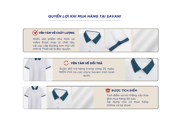 - Hỗ trợ đổi hàng trong vòng 30 ngày và miễn phí tại tất cả chi nhánh thuộc hệ thống thời trang Savani.