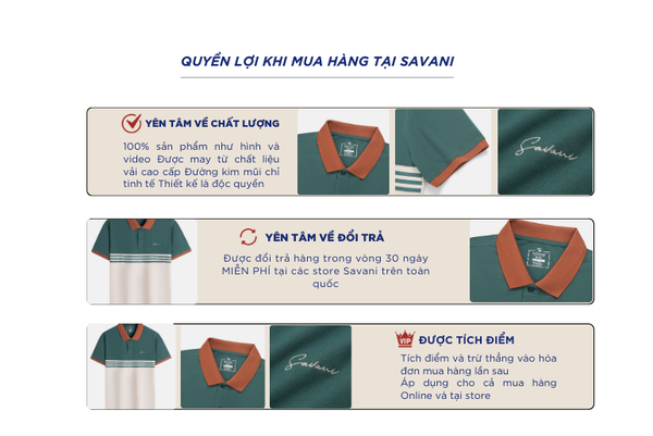 - Hỗ trợ đổi hàng trong vòng 30 ngày và miễn phí tại tất cả chi nhánh thuộc hệ thống thời trang Savani.