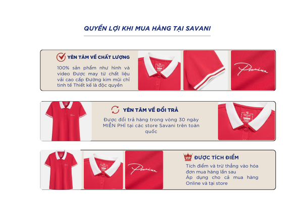 Áo Polo nữ là một trong những sản phẩm tiên phong được Savani đặc biệt chú trọng về chất liệu. Sự kết hợp giữa sợi tự nhiên (Cotton) với sự bền bỉ, chống nhăn của sợi tổng hợp (Polyester) và độ co giãn linh hoạt của Spandex tạo nên một chất liệu mang lại cảm giác thoải mái, giữ form tốt và phù hợp cho các hoạt động năng động.