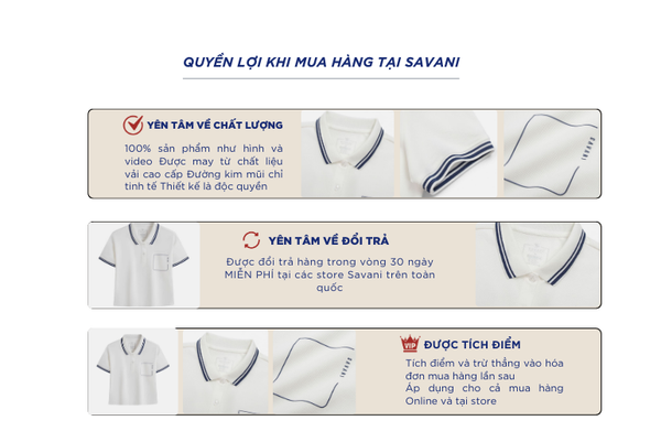 - Hỗ trợ đổi hàng trong vòng 30 ngày và miễn phí tại tất cả chi nhánh thuộc hệ thống thời trang Savani.