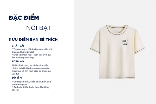 Áo phông trẻ em là một trong những sản phẩm tiên phong được Savani đặc biệt chú trọng về chất liệu. Vải được dệt hoàn toàn từ sợi bông tự nhiên, không pha trộn với các loại sợi nhân tạo, vải Cotton nguyên chất giữ được đầy đủ những đặc tính tự nhiên của sợi bông: mềm mại, thoáng khí và thân thiện với da.