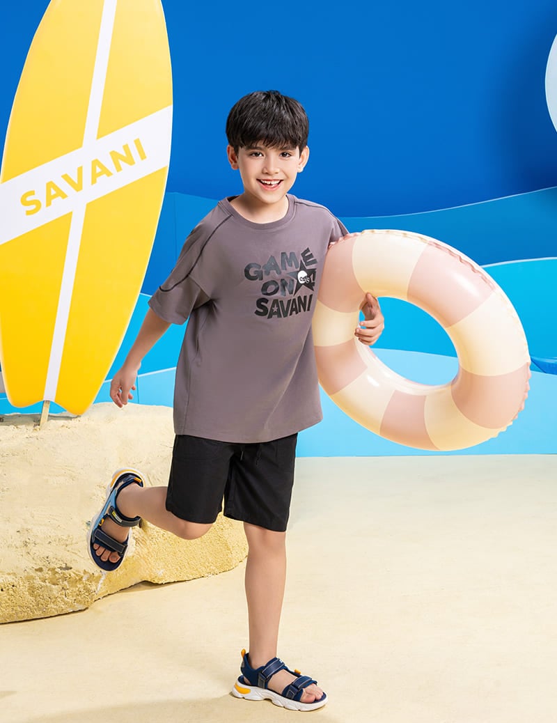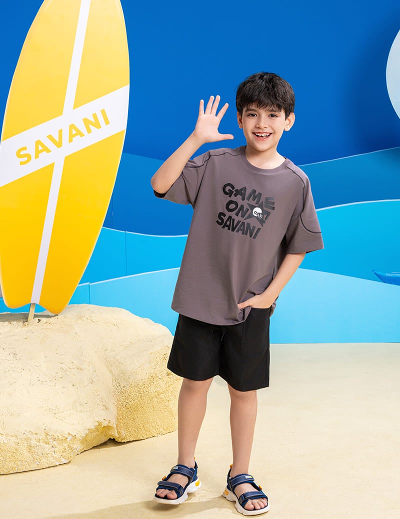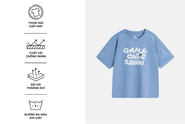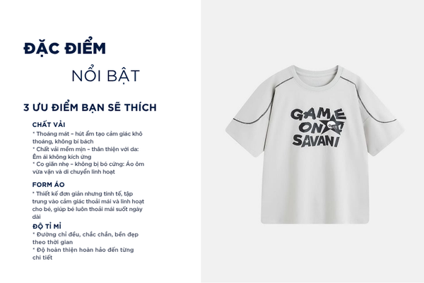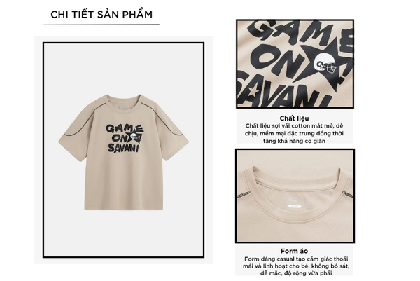 Áo phông trẻ em là một trong những sản phẩm tiên phong được Savani đặc biệt chú trọng về chất liệu. Sự kết hợp giữa sợi Cotton tự nhiên chiếm phần lớn và một lượng nhỏ Spandex nhằm tăng độ co giãn và linh hoạt. Sự pha trộn này tạo nên một loại vải có bề mặt mềm mại, thấm hút tốt nhưng vẫn giữ được độ đàn hồi cao, mang lại cảm giác thoải mái suốt ngày dài.