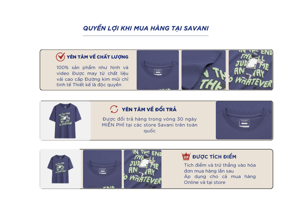 - Hỗ trợ đổi hàng trong vòng 30 ngày và miễn phí tại tất cả chi nhánh thuộc hệ thống thời trang Savani.