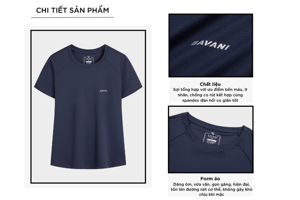 Áo phông nữ là một trong những sản phẩm tiên phong được Savani đặc biệt chú trọng về chất liệu. Sự kết hợp giữa Polyester (88%) và Spandex (12%) giúp sản phẩm có các ưu điểm như: Độ bền cao, chống nhăn, nhanh khô và giữ màu tốt, co giãn tốt, ôm cơ thể mà vẫn thoải mái.