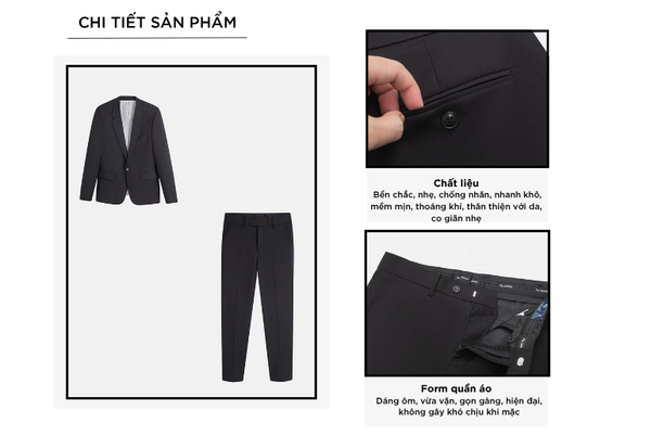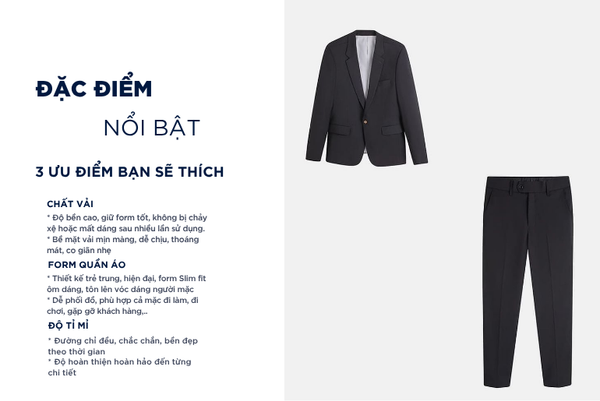 - Form Slim fit form vừa, mang lại vẻ ngoài gọn gàng mà không tạo cảm giác quá bó sát, giúp người mặc tự tin trong mọi hoàn cảnh.