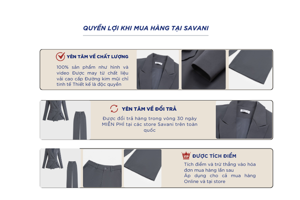 - Hỗ trợ đổi hàng trong vòng 30 ngày và miễn phí tại tất cả chi nhánh thuộc hệ thống thời trang Savani.