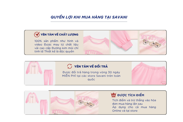 Bộ đông trẻ em là một trong những sản phẩm tiên phong được Savani đặc biệt chú trọng về chất liệu. Sự kết hợp giữa sợi Cotton tự nhiên chiếm phần lớn và một lượng nhỏ Spandex nhằm tăng độ co giãn và linh hoạt. Sự pha trộn này tạo nên một loại vải có bề mặt mềm mại, thấm hút tốt nhưng vẫn giữ được độ đàn hồi cao, mang lại cảm giác thoải mái suốt ngày dài.
