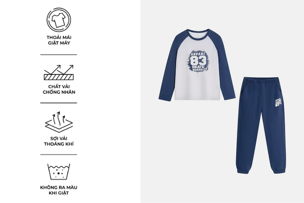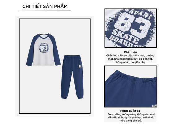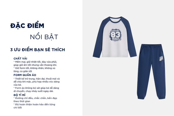 Bộ đông trẻ em là một trong những sản phẩm tiên phong được Savani đặc biệt chú trọng về chất liệu. Sự kết hợp giữa sợi Cotton tự nhiên chiếm phần lớn và một lượng nhỏ Spandex nhằm tăng độ co giãn và linh hoạt. Sự pha trộn này tạo nên một loại vải có bề mặt mềm mại, thấm hút tốt nhưng vẫn giữ được độ đàn hồi cao, mang lại cảm giác thoải mái suốt ngày dài.