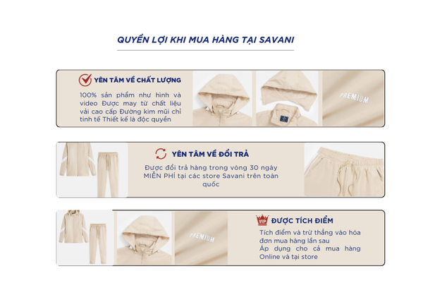 - Hỗ trợ đổi hàng trong vòng 30 ngày và miễn phí tại tất cả chi nhánh thuộc hệ thống thời trang Savani.