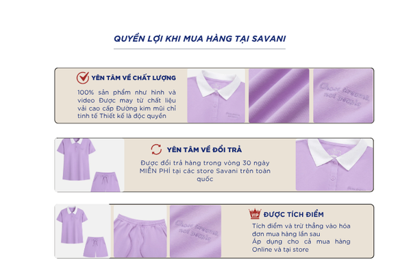 - Hỗ trợ đổi hàng trong vòng 30 ngày và miễn phí tại tất cả chi nhánh thuộc hệ thống thời trang Savani.
