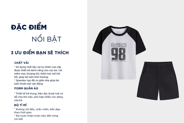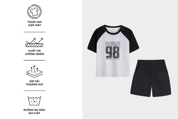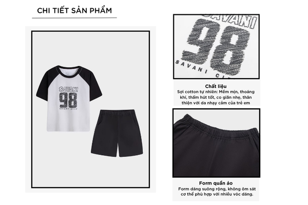 Bộ hè trẻ em là một trong những sản phẩm tiên phong được Savani đặc biệt chú trọng về chất liệu. Sự kết hợp giữa sợi Cotton tự nhiên chiếm phần lớn và một lượng nhỏ Spandex nhằm tăng độ co giãn và linh hoạt. Sự pha trộn này tạo nên một loại vải có bề mặt mềm mại, thấm hút tốt nhưng vẫn giữ được độ đàn hồi cao, mang lại cảm giác thoải mái suốt ngày dài.