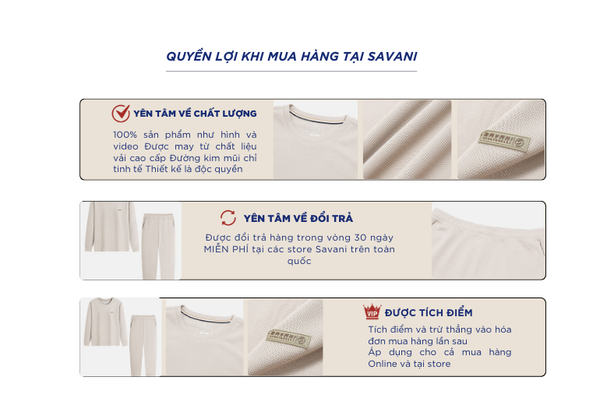 - Hỗ trợ đổi hàng trong vòng 30 ngày và miễn phí tại tất cả chi nhánh thuộc hệ thống thời trang Savani.