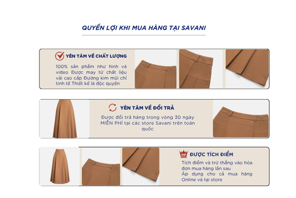 - Hỗ trợ đổi hàng trong vòng 30 ngày và miễn phí tại tất cả chi nhánh thuộc hệ thống thời trang Savani.