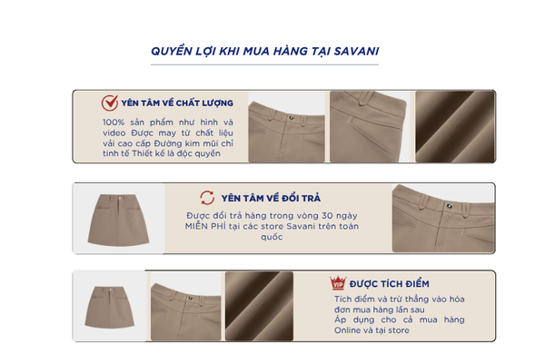 - Hỗ trợ đổi hàng trong vòng 30 ngày và miễn phí tại tất cả chi nhánh thuộc hệ thống thời trang Savani.
