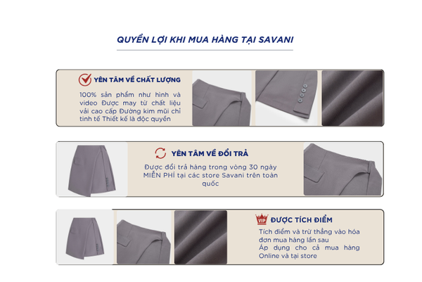 - Hỗ trợ đổi hàng trong vòng 30 ngày và miễn phí tại tất cả chi nhánh thuộc hệ thống thời trang Savani.
