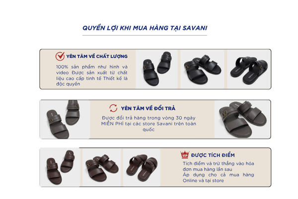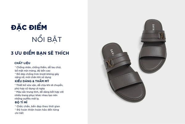 Dép nam là một trong những sản phẩm tiên phong được Savani đặc biệt chú trọng về chất liệu. Sử dụng da tổng hợp (PU) có bề mặt mềm mại, chống bong tróc, hạn chế thấm nước và dễ vệ sinh. Đường may chắc chắn, tạo cảm giác ôm chân và thoải mái khi di chuyển. Đế dép Plastic có độ bền cao, trọng lượng nhẹ, chống thấm nước, trơn trượt, dễ dàng vệ sinh.
