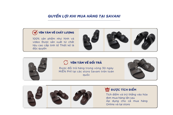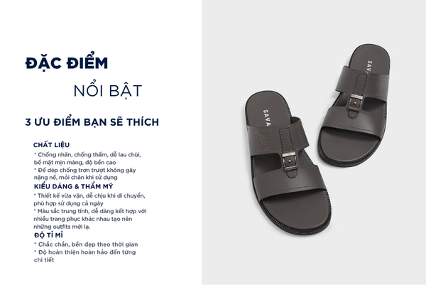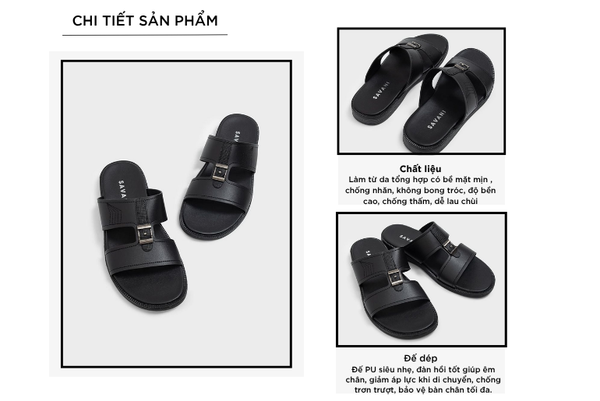Dép nam là một trong những sản phẩm tiên phong được Savani đặc biệt chú trọng về chất liệu. Sử dụng da tổng hợp (PU) có bề mặt mềm mại, chống bong tróc, hạn chế thấm nước và dễ vệ sinh. Đường may chắc chắn, tạo cảm giác ôm chân và thoải mái khi di chuyển. Đế dép Plastic có độ bền cao, trọng lượng nhẹ, chống thấm nước, trơn trượt, dễ dàng vệ sinh.