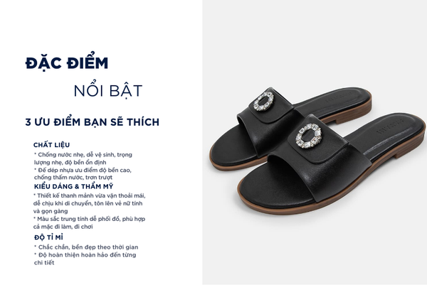 - Thiết kế bệt tiện dụng: Gót thấp - mang lại sự thoải mái tối đa khi di chuyển, kể cả trong thời gian dài.