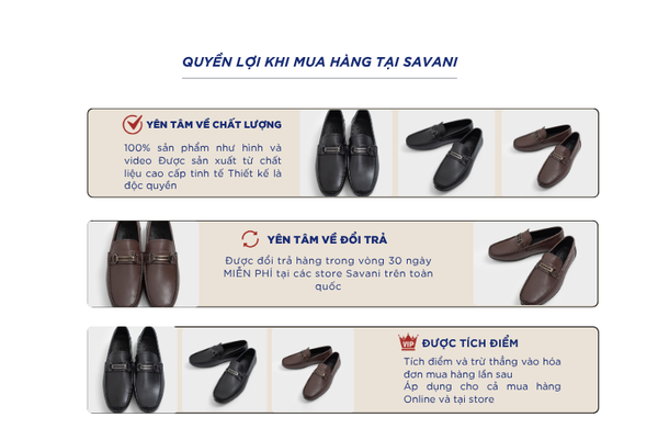 Giày moscasin nam là một trong những sản phẩm tiên phong được Savani đặc biệt chú trọng về chất liệu. Sử dụng da bò cao cấp giúp Bề mặt da mịn mềm tự nhiên, có độ đàn hồi cao, thông thoáng, ít thấm nước nhẹ, giúp chân không bị bí khi di chuyển nhiều. Đế cao su có độ đàn hồi và độ bám tốt, Chống trơn trượt hiệu quả, Chịu mài mòn tốt, ít hao mòn theo thời gian, êm chân, giảm áp lực lên gót & lòng bàn chân