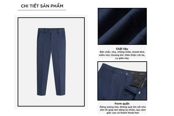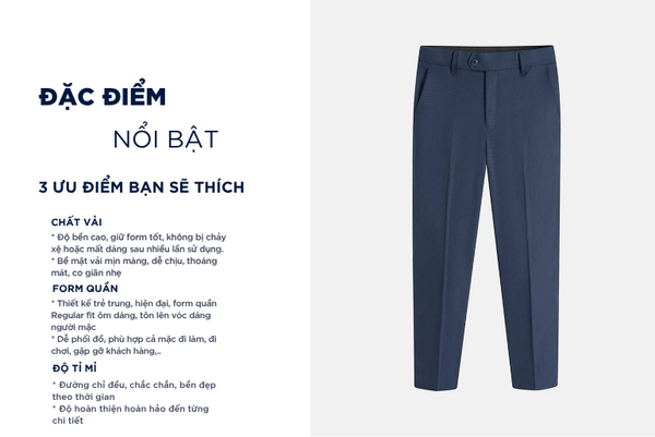 - Màu sắc trẻ trung, thanh lịch, rất dễ phối đồ: Có thể mặc với áo sơ mi, áo polo, áo phông,...Quần âu rất đa năng phù hợp cả khi mặc đi chơi, đi làm, đi gặp khách hàng,...
