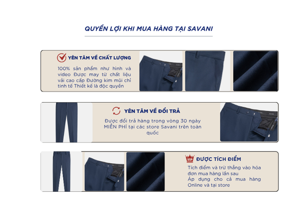 Quần âu nam là một trong những sản phẩm tiên phong được Savani đặc biệt chú trọng về chất liệu. Sự kết hợp giữa ba loại sợi Polyester (83%) - Rayon (16%) - Spandex (1%) mang tới những lợi ích: Bền, nhẹ, mịn, thoáng mát và có độ co giãn nhẹ