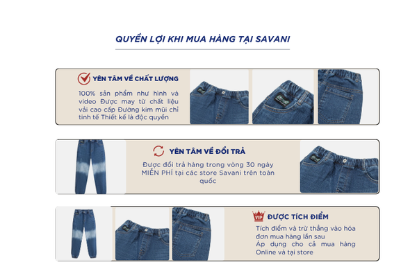 Quần jean trẻ em là một trong những sản phẩm tiên phong được Savani đặc biệt chú trọng về chất liệu. Sự kết hợp giữa sợi Cotton tự nhiên chiếm phần lớn và một lượng nhỏ Spandex nhằm tăng độ co giãn và linh hoạt. Sự pha trộn này tạo nên một loại vải có bề mặt mềm mại, thấm hút tốt nhưng vẫn giữ được độ đàn hồi cao, mang lại cảm giác thoải mái suốt ngày dài.