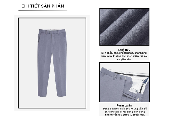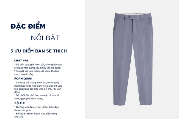 - Màu sắc trẻ trung, thanh lịch, rất dễ phối đồ: Có thể mặc với áo sơ mi, áo polo, áo phông,...Quần âu rất đa năng phù hợp cả khi mặc đi chơi, đi làm, đi gặp khách hàng,...