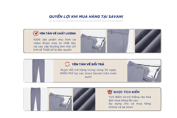 Quần âu nam là một trong những sản phẩm tiên phong được Savani đặc biệt chú trọng về chất liệu. Sự kết hợp giữa ba loại sợi Polyester (74%) - Rayon (25%) - Spandex (1%) mang tới những lợi ích: Bền, nhẹ, mịn, thoáng mát và có độ co giãn nhẹ