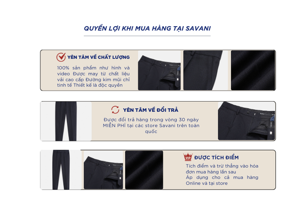 Quần âu nam là một trong những sản phẩm tiên phong được Savani đặc biệt chú trọng về chất liệu. Sự kết hợp giữa ba loại sợi Polyester (76%) - Rayon (21%) - Spandex (3%) mang tới những lợi ích: Bền, nhẹ, mịn, thoáng mát và có độ co giãn nhẹ